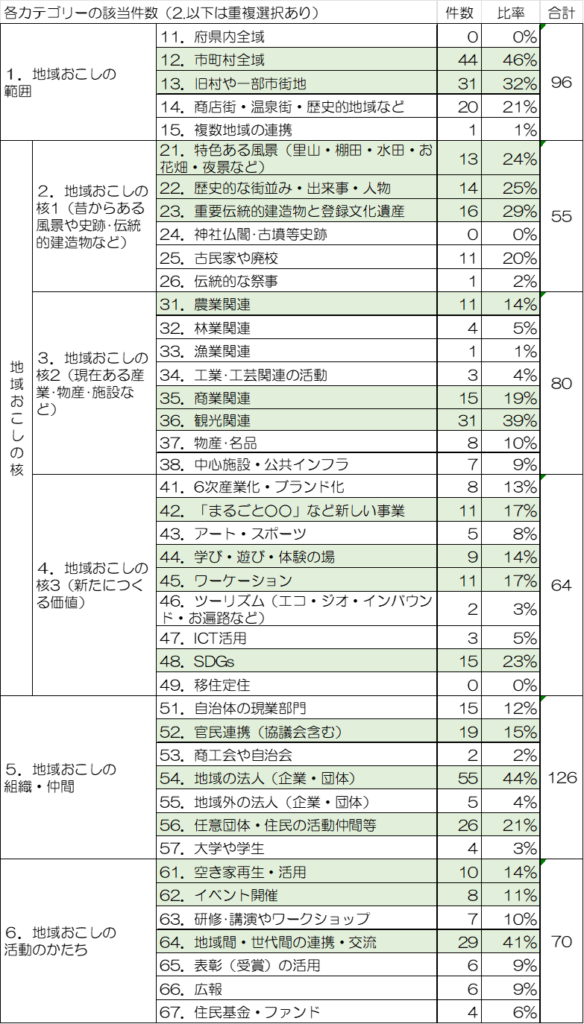 緑で着色したキーワードは、各カテゴリー内で、上位の2/3をカバーする内容を示しています。各カテゴリーで多い事例は、緑の2~4キーワードに該当するという状態です。