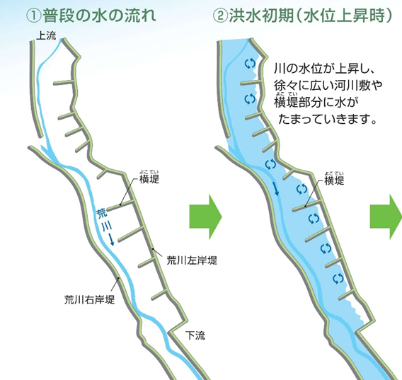 横堤は、荒川中流部の広い川幅を利用した洪水対策です。