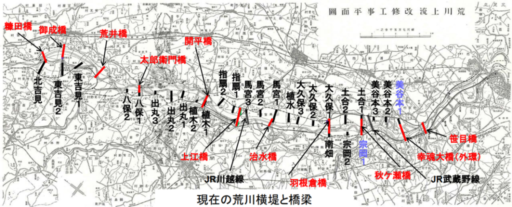 荒川中流部は、元々、蛇行が多く洪水時に氾濫する川でしたが、大正~昭和初期に、治水対策として河道の直線化と堤防の整備が行われ、併せて広い高水敷を利用する横堤が構築されました。